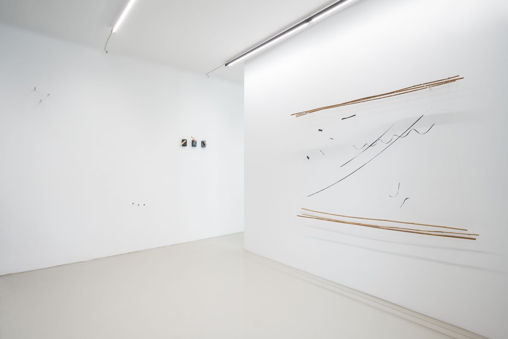 Jared GinsburgHanging Drawings XXVIII, XXIX, XXX, 2020Bamboo, rubber, string, jewellers wire and wooden box210.5 x 14.5 x 15 cm ; installation approx 150 x 205 x 30 cm -